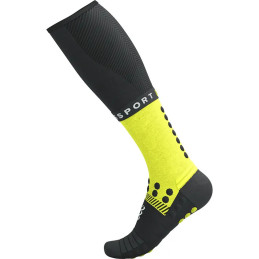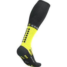Vékony szálú kompressziós zokni edzésre és versenyzéshez, hosszirányú bordázással. 19 Hgmm-es nyomást fejt ki a lábra. Jobb és bal lábra eltérően formázott zoknikból áll a pár.